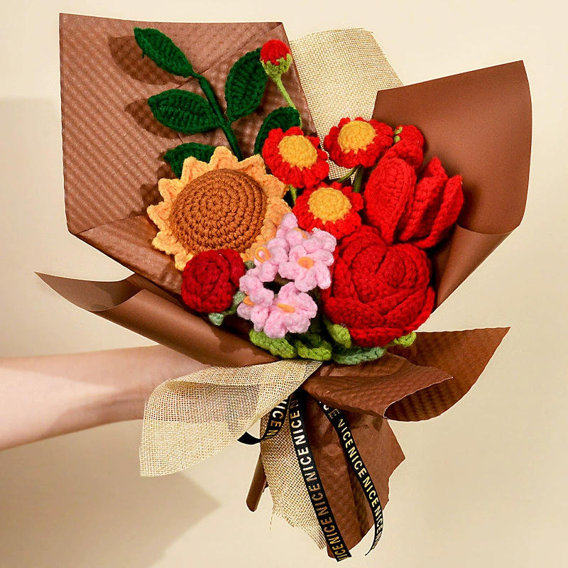 ช่อดอกไม้ไหมพรมถักมือลายดอกไม้ไล่เฉดสี ดอกกุหลาบ ดอกทานตะวัน ของขวัญวันวาเลนไทน์