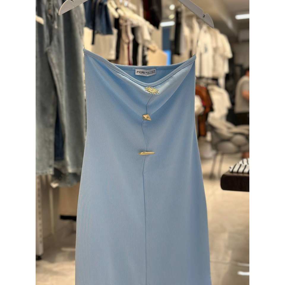 ชุดเดรสคอวีสีฟ้าฟิโอริ เอวธรรมชาติ สไตล์วินเทจ ชุดราตรีหรูหรา