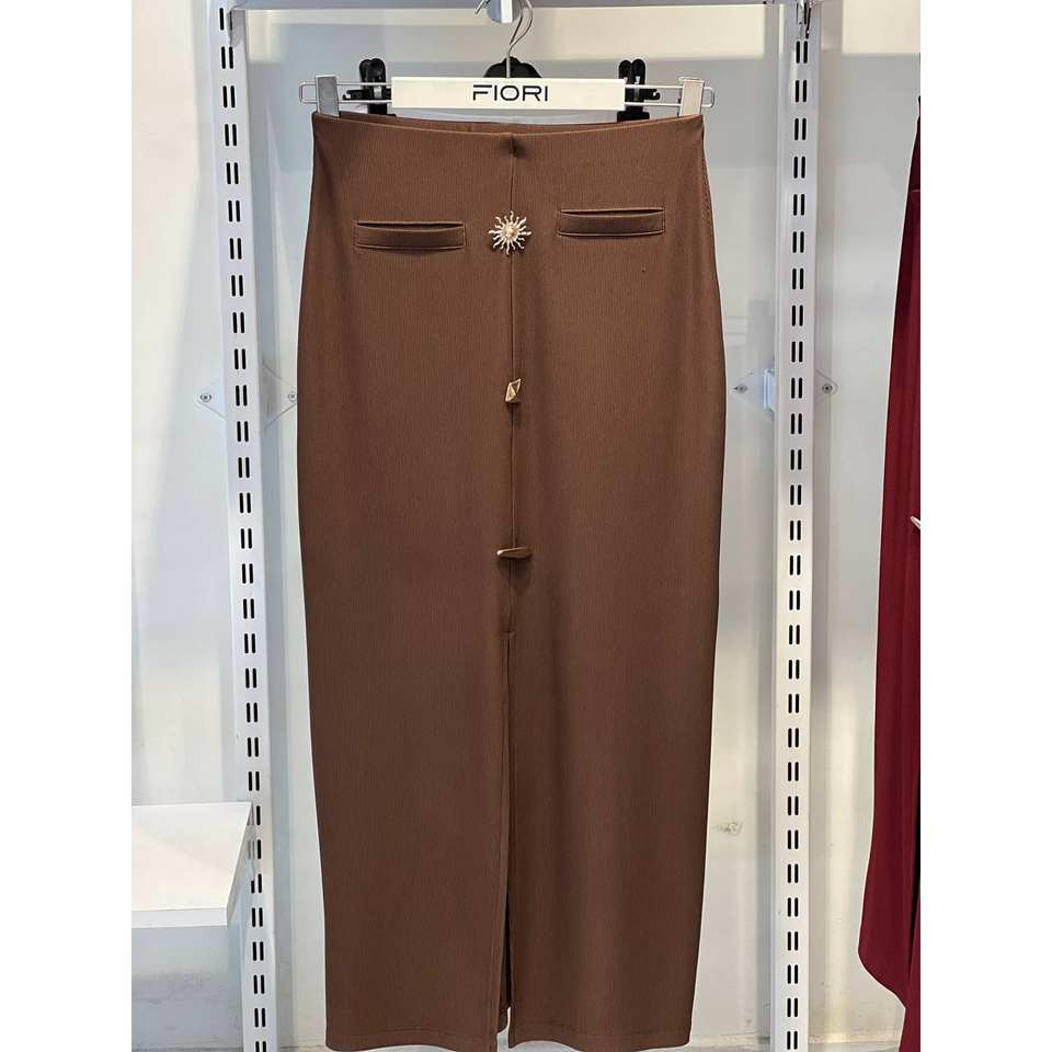 กระโปรงเอวสูงฟิโอรีสำหรับผู้หญิง สีน้ำตาล แต่งลายริบบิ้น พร้อมดีเทลหัวเข็มขัด ทรงเข้ารูป ความยาวปานกลาง