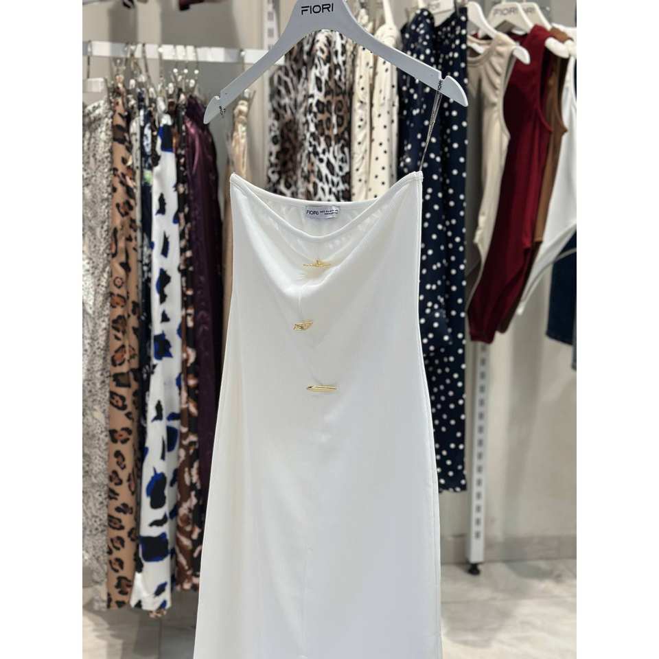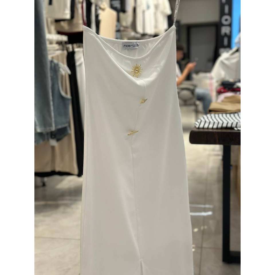 เดรสสายเดี่ยวสีขาว Fiori แบบเปิดไหล่ ความยาวปานกลาง ผ้าซาติน สายสปาเก็ตตี้ ดีไซน์หรูหราสำหรับงานกลางคืน เอวทรงธรรมชาติ สวมใส่สบาย
