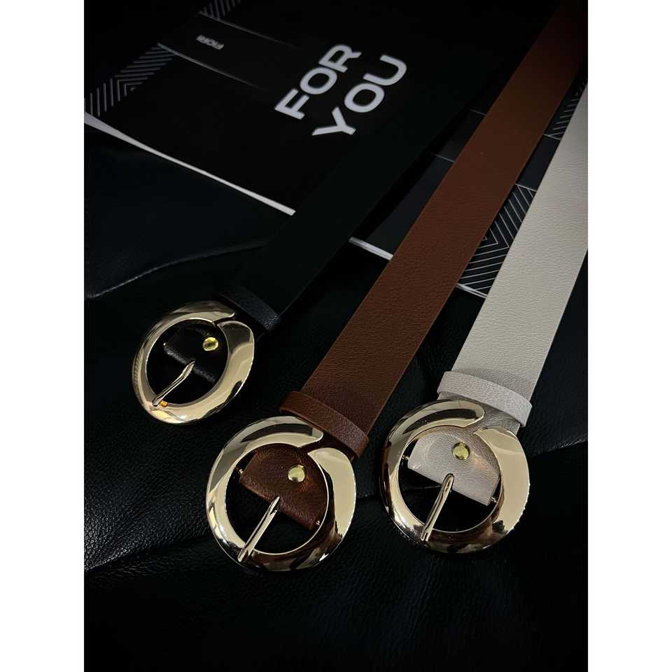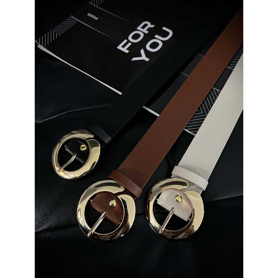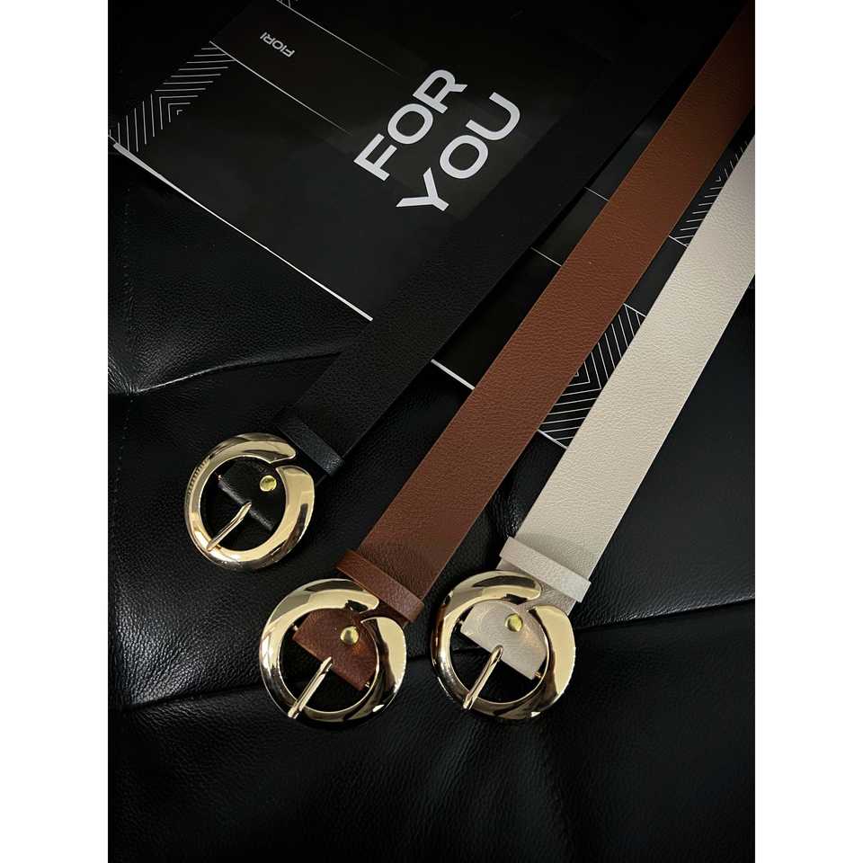 เข็มขัด PU สำหรับผู้หญิงของฟิโอริพร้อมหัวเข็มขัดโลหะผสมทองทรงกลมสไตล์ลำลองแบบปิดด้วยเข็มสีดำ สีน้ำตาล สีเบจ