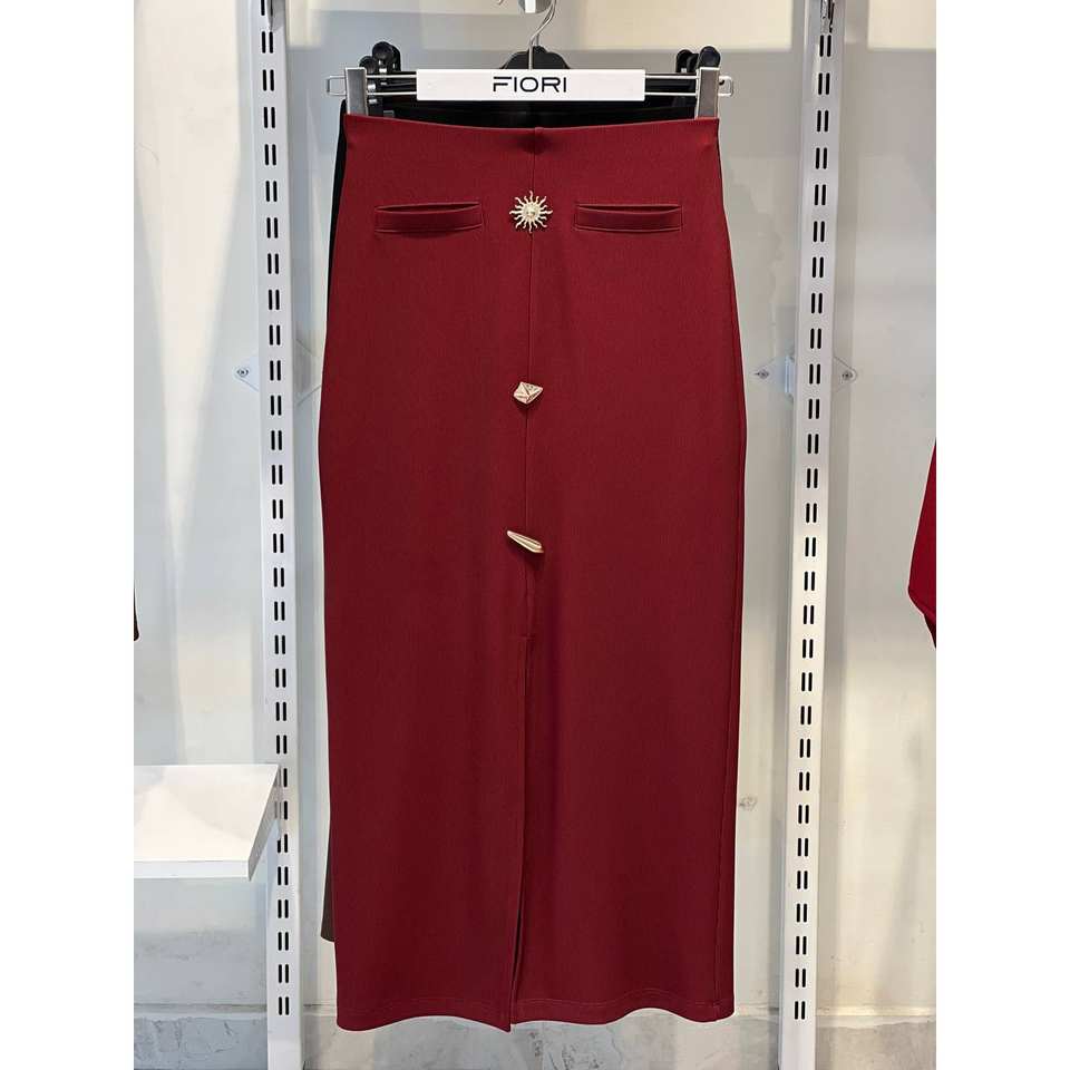 กระโปรงทรงดินสอสีแดงสำหรับผู้หญิง Fiori แต่งกระดุม ดีไซน์เอวปกติ ผ้ายืดผสมโพลีเอสเตอร์ ทรงเข้ารูป