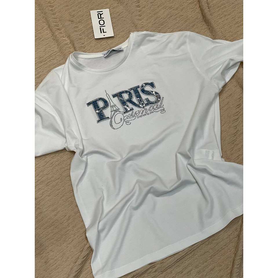 เสื้อยืดผู้หญิงฟิโอรีสีขาวพิมพ์ลายปารีสกลิตเตอร์แขนปกติผ้าฝ้ายเจอร์ซีย์ 100% ระบายอากาศได้ดี