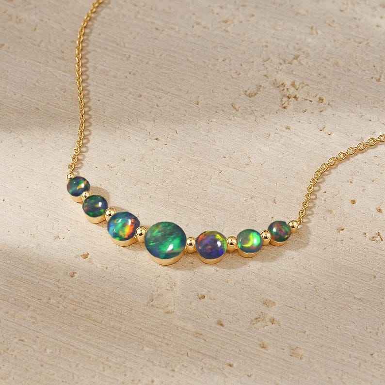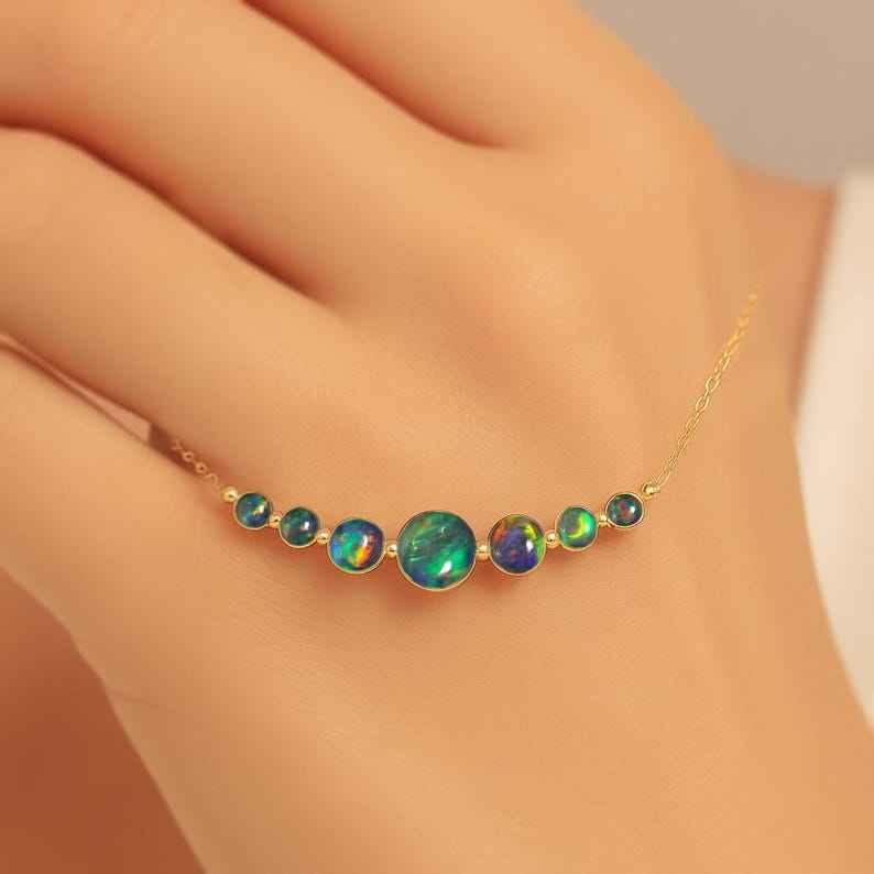 Fire Black Opal Bar Necklace Seven Stone Design