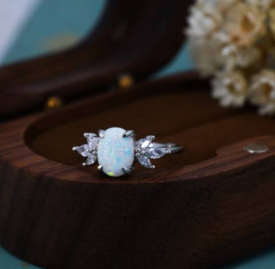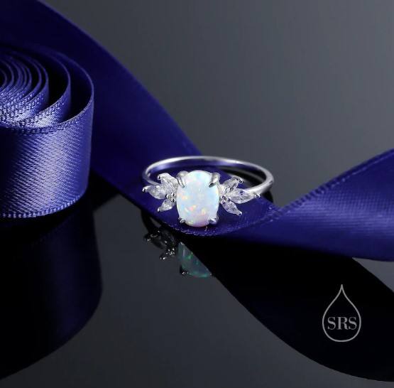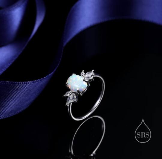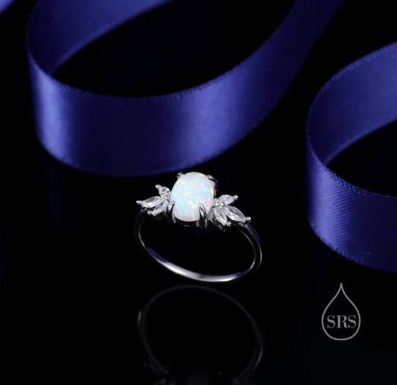 แหวนโอปอลไฟและแหวนเพชร CZ เงินสเตอร์ลิง แหวนมงกุฎโอปอล แหวนโอปอลหินสังเคราะห์ แหวนโอปอลสีขาว
