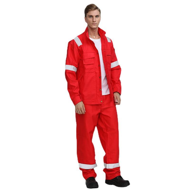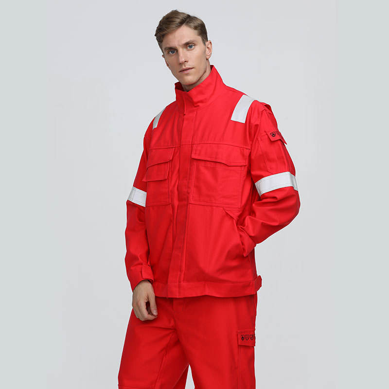 เสื้อแจ็คเก็ตผ้าฝ้ายสีแดงทนไฟพร้อมแถบสะท้อนแสงสำหรับใช้งานเพื่อความปลอดภัยในอุตสาหกรรม