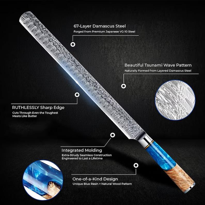 มีดหั่นปลา ย่างเนื้อ และผลไม้ ด้ามไม้ลายไม้สีน้ำเงิน ใบมีดเหล็กคาร์บอน ขนาด 12 นิ้ว เป็นมิตรกับสิ่งแวดล้อม ล้างในเครื่องล้างจานได้