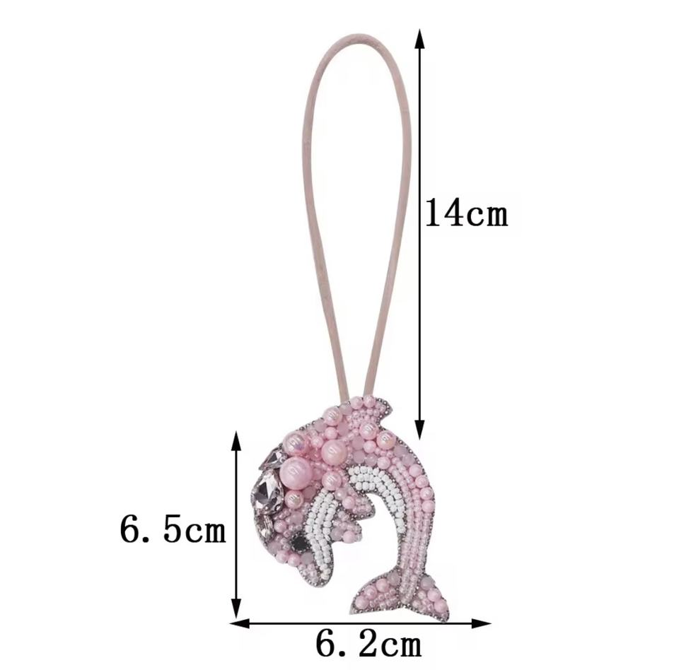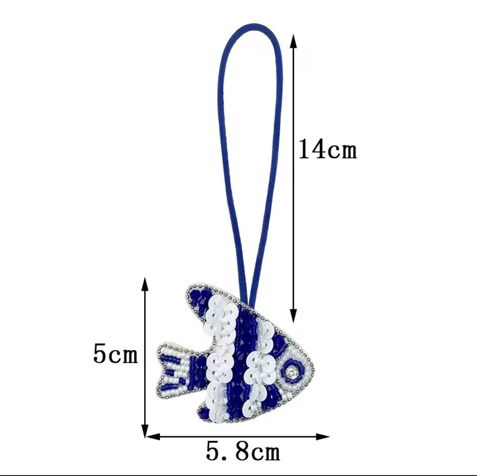 พวงกุญแจรูปปลาสีม่วงขาว งานแฮนด์เมดสไตล์วินเทจ ประดับคริสตัลหลากสีสัน ตัวอักษรภาษาอังกฤษแบบเรียงต่อกัน พร้อมสายคล้องข้อมือ