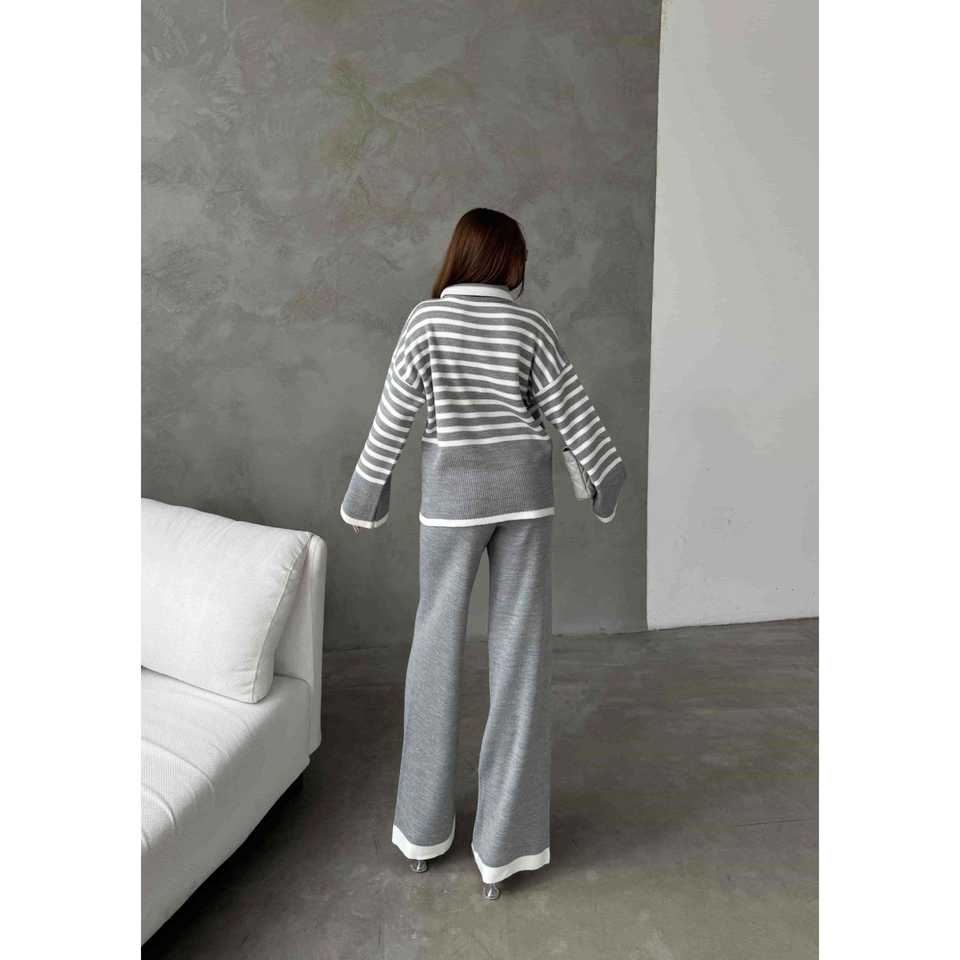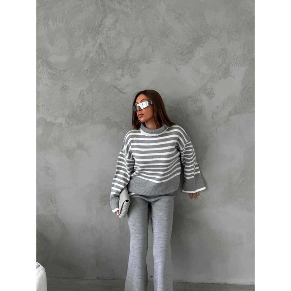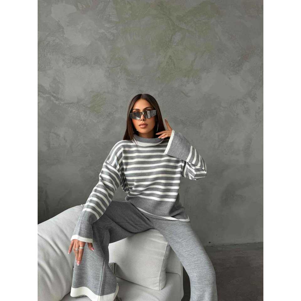 ชุดเสื้อไหมพรมคอเต่าลายทางสีเทาสำหรับผู้หญิง ไซส์ S พร้อมกางเกงขายาว ชุดลำลองแสนสบายสำหรับฤดูหนาว
