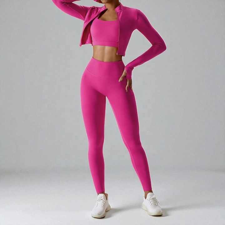 ชุดออกกำลังกายสำหรับผู้หญิง 3 ชิ้น เสื้อแจ็คเก็ตโยคะ กางเกงเลกกิ้งออกกำลังกาย เสื้อชั้นในกีฬา ชุดกีฬา