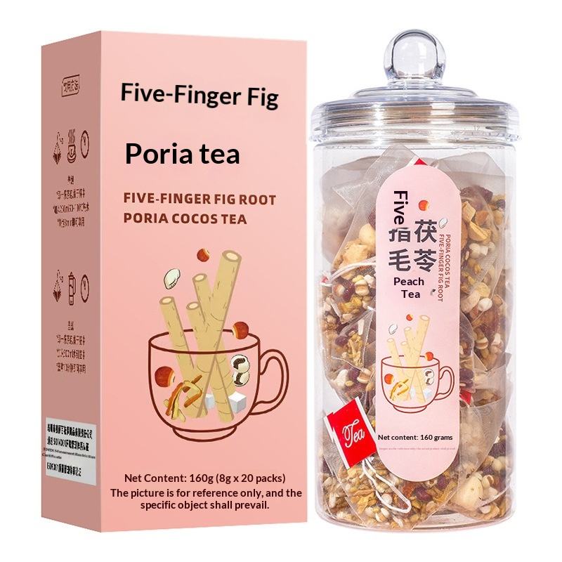 ชาสมุนไพรผสมกลิ่นพีชห้านิ้ว ผสมเปลือกส้ม พุทราจีน บัควีท โกร์กอน และเมล็ดข้าวฟ่าง บรรจุในถุงชา กล่องชา