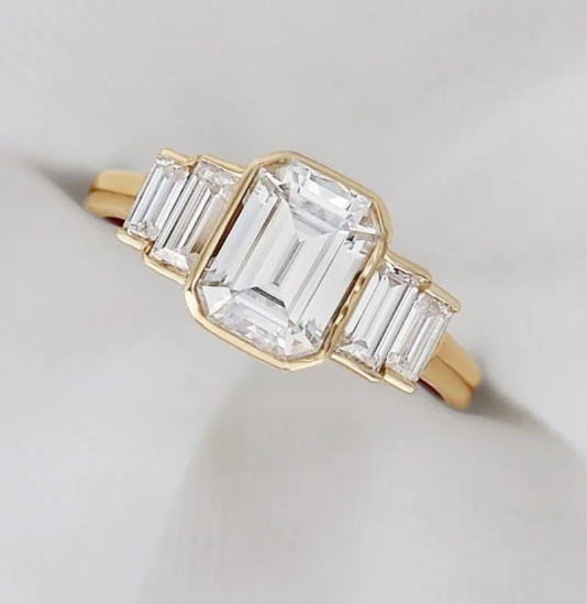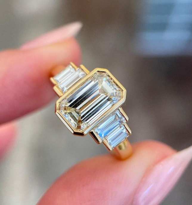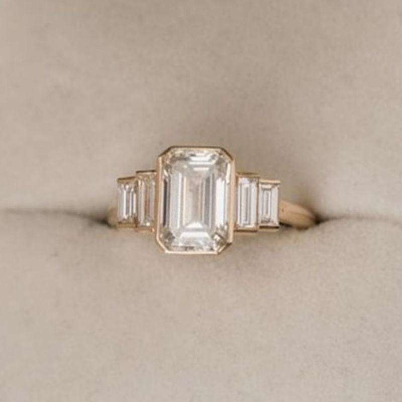 Five Stone Wedding Ring Emerald Cut Baguette Cut Side Stone Moissanite Ring 925 Sterling Silver Bezel Set Engagement Gift Ring