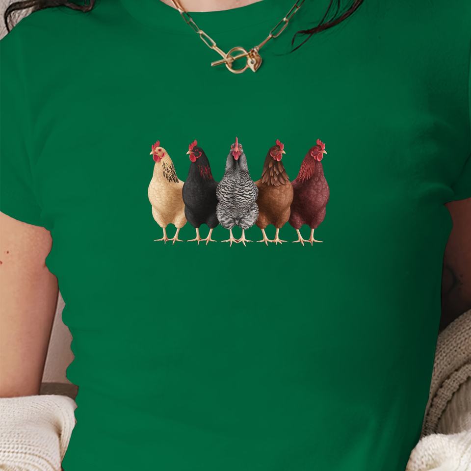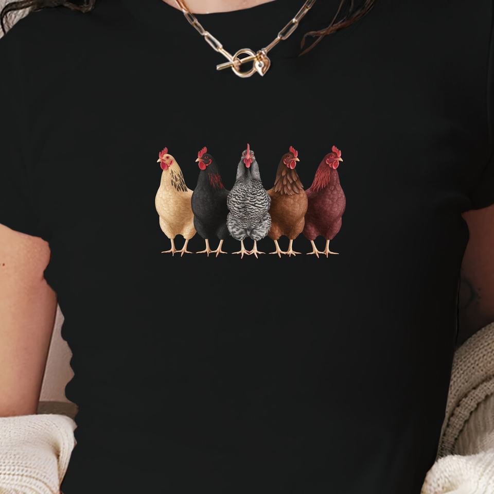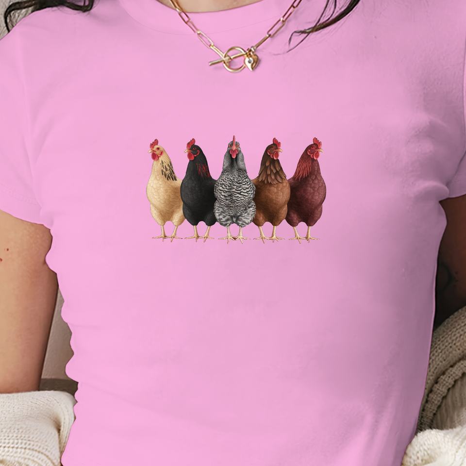 เสื้อยืดแขนสั้นพิมพ์ลายถักทรงเข้ารูป Y2K สำหรับผู้หญิงลายไก่หลากสีสันห้าตัวเรียงกัน