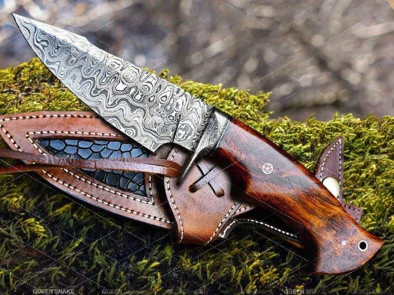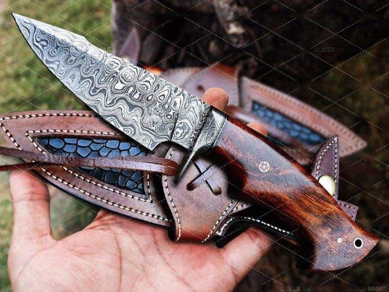 มีดใบตายเหล็กดามัสกัสทรงดรอปพอยต์ สำหรับตั้งแคมป์ กิจกรรมกลางแจ้ง เอาตัวรอด ใช้ในยุทธวิธี ทำด้วยมือ พร้อมปลอกมีด ด้ามไม้พะยูงธรรมชาติ รับผลิตแบบ OEM
