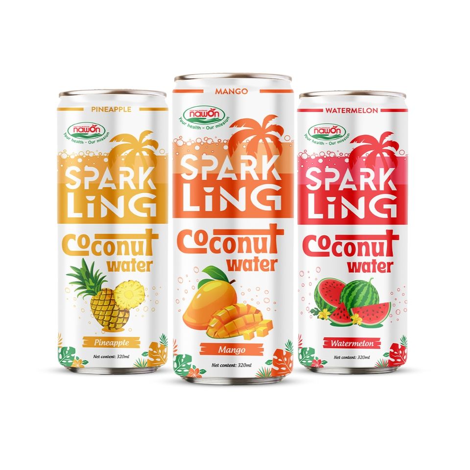 เครื่องดื่มน้ำมะพร้าวอัดลม 320 มล. น้ำมะพร้าวอัดลมรสผลไม้ โรงงานผลิตเครื่องดื่มแบบ OEM รับผลิตแบรนด์ส่วนตัว