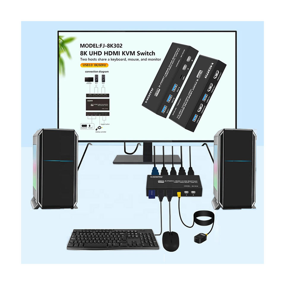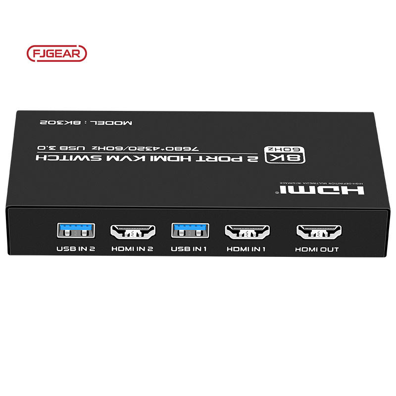 สวิตช์ KVM Fjgear ประสิทธิภาพสูง UHD USB3.0 8K HDMI 7680*4320/60Hz สีดำ สวิตช์ HDMI 2 พอร์ต สำหรับแชร์เครื่องพิมพ์