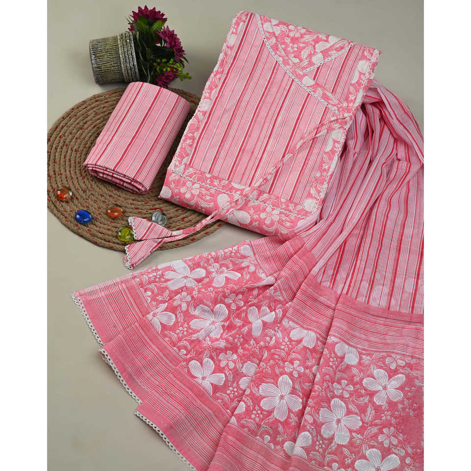 ชุดเดรสผ้าฝ้ายแท้พิมพ์ลายดอกไม้นกกระเรียน (SHKS1203) ลูกไม้สไตล์ angrakha ขนาดฟรีไซส์