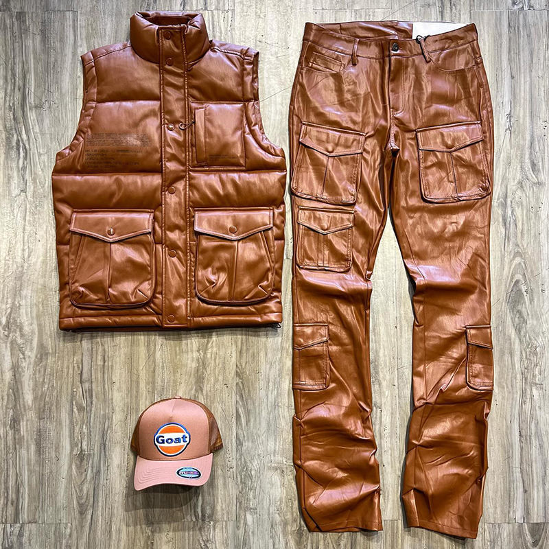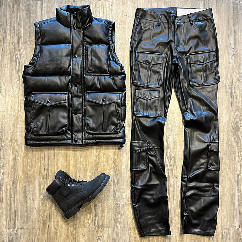 ชุดกางเกงคาร์โก้ทรงแฟลร์ ชุดแทรคสูทหนังสำหรับผู้ชาย ชุดหนังสั่งทำพิเศษ เสื้อกั๊กสตรีทแวร์ปักลายซิป เสื้อกั๊กบุผ้านวม PU แบบซ้อน