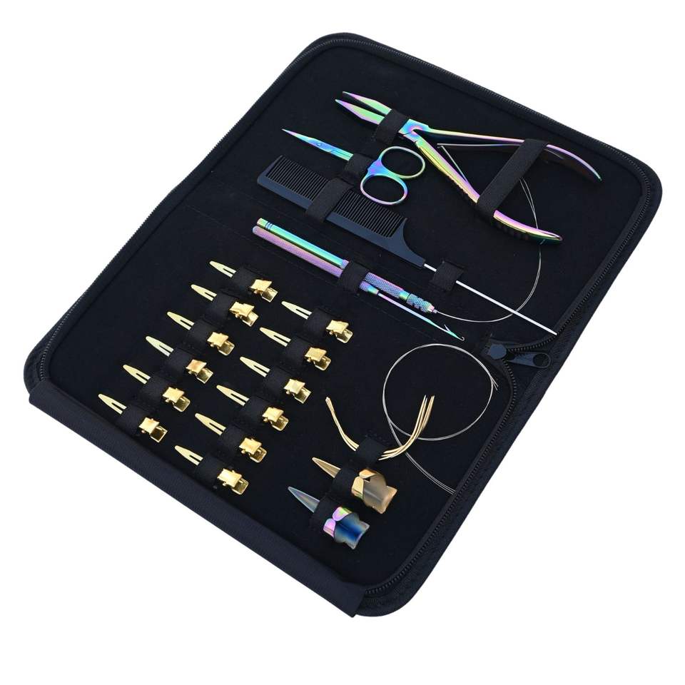 เครื่องมือต่อผมพร้อมคีมหนีบแบบแบน ห่วงเกี่ยว และเครื่องร้อยด้าย