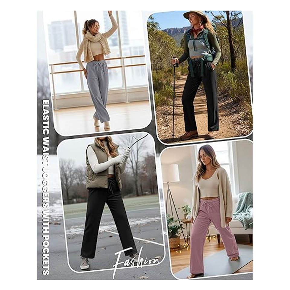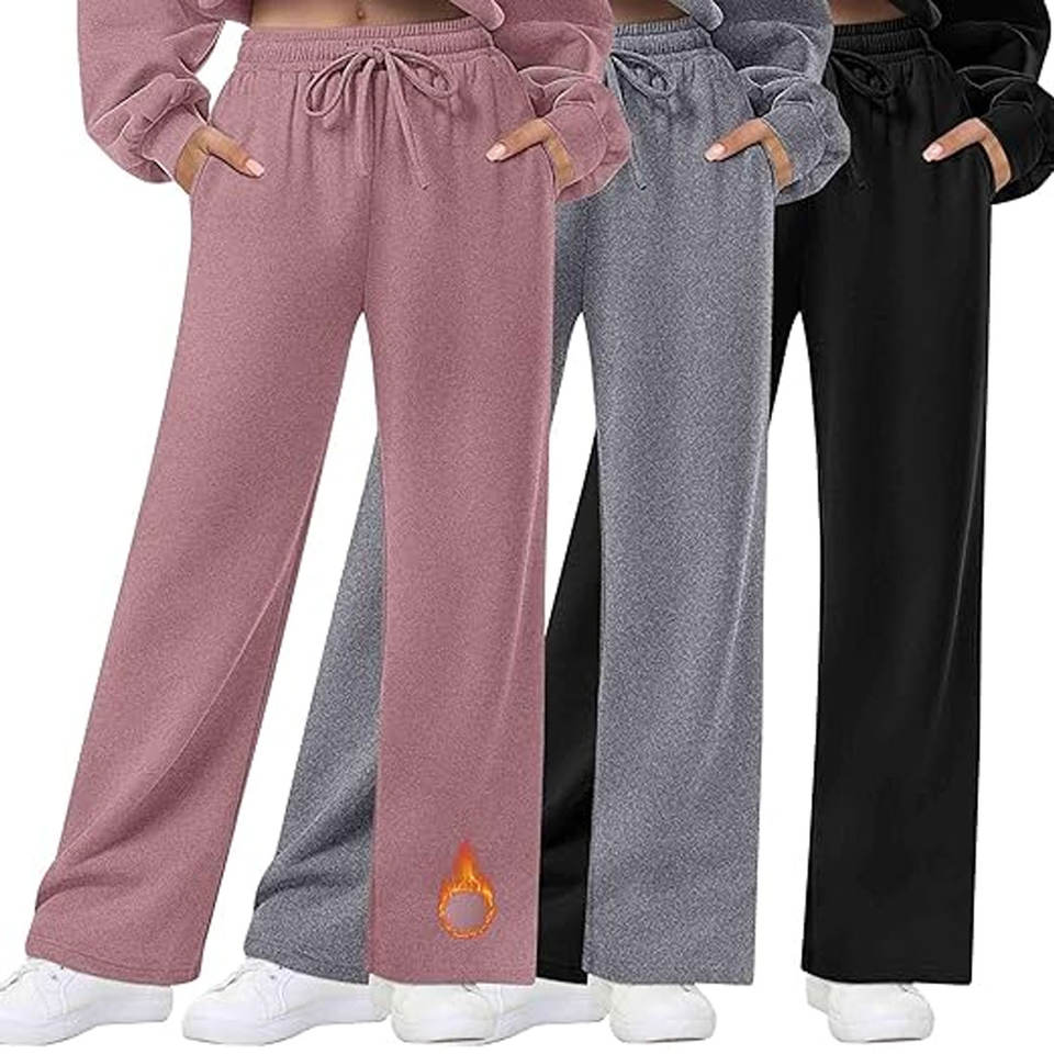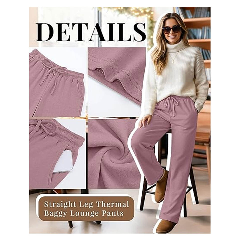 กางเกงวอร์มขายาวทรงตรงบุขนแกะ กางเกงลำลองทรงหลวมมีกระเป๋า เอวสูงยางยืดสำหรับผู้หญิง