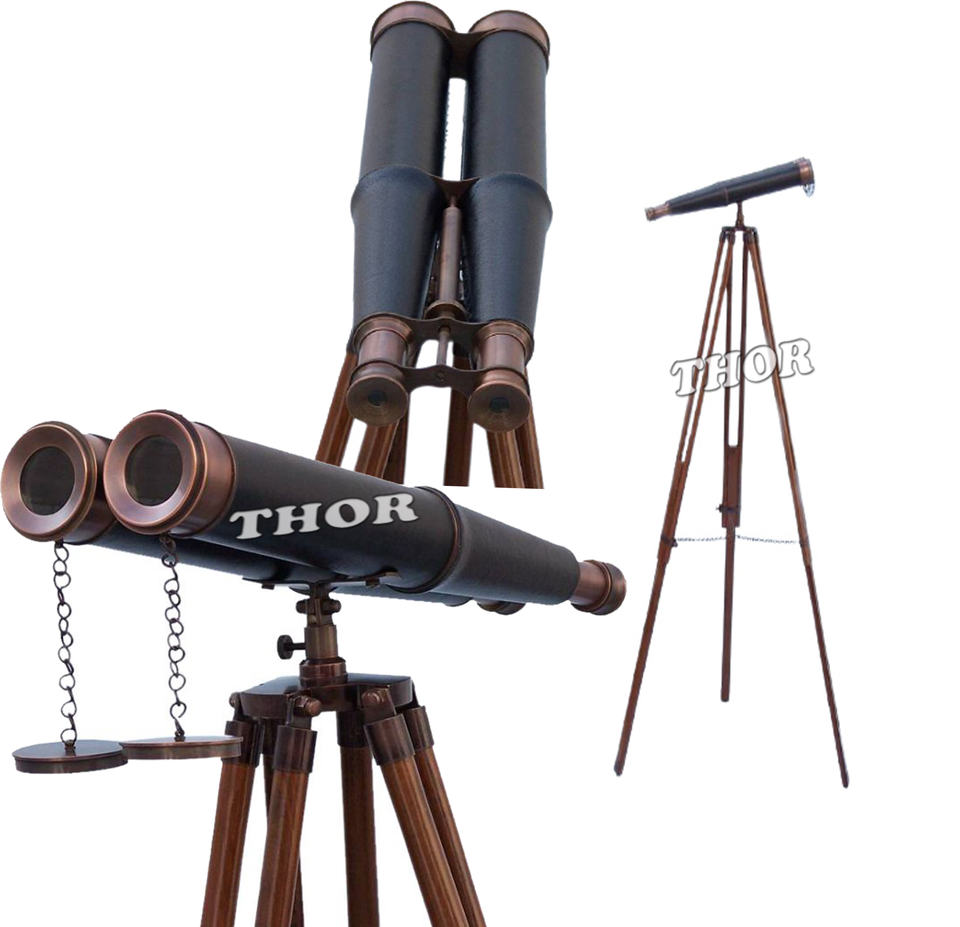 กล้องส่องทางไกลแบบตั้งพื้นโบราณ ทำจากทองเหลือง พร้อมขาตั้งไม้หนังสูง 62 นิ้ว
