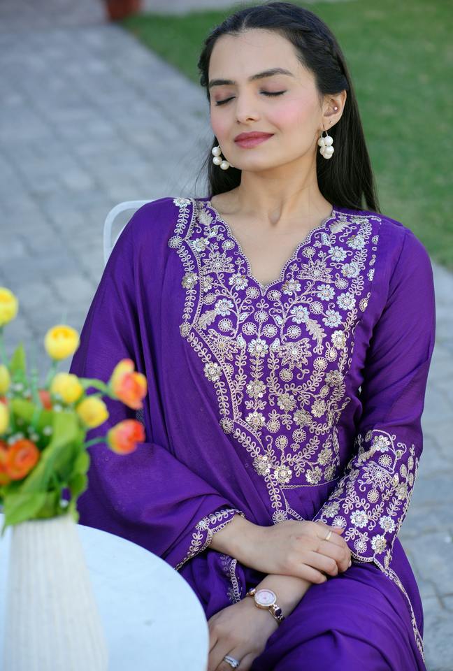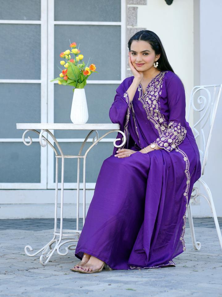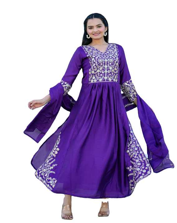 Floor-Length Washable Chinon Gown with V-Neck Embroidered Sequence Work Woven Pattern Solid and Patchwork Design