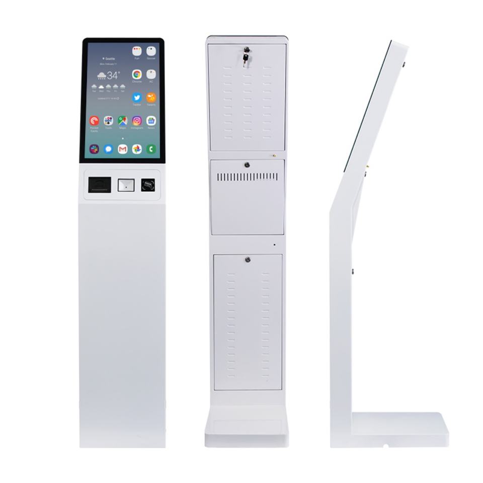ตู้คีออสก์แบบตั้งพื้นขนาด 21 นิ้ว สำหรับโรงแรม ระบบชำระเงินด้วยตนเอง พร้อมเครื่องพิมพ์ระบบแอนดรอยด์ และแท่นวาง POS