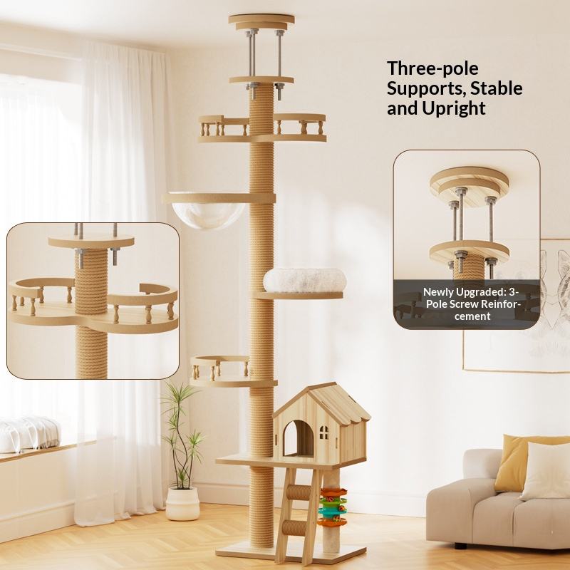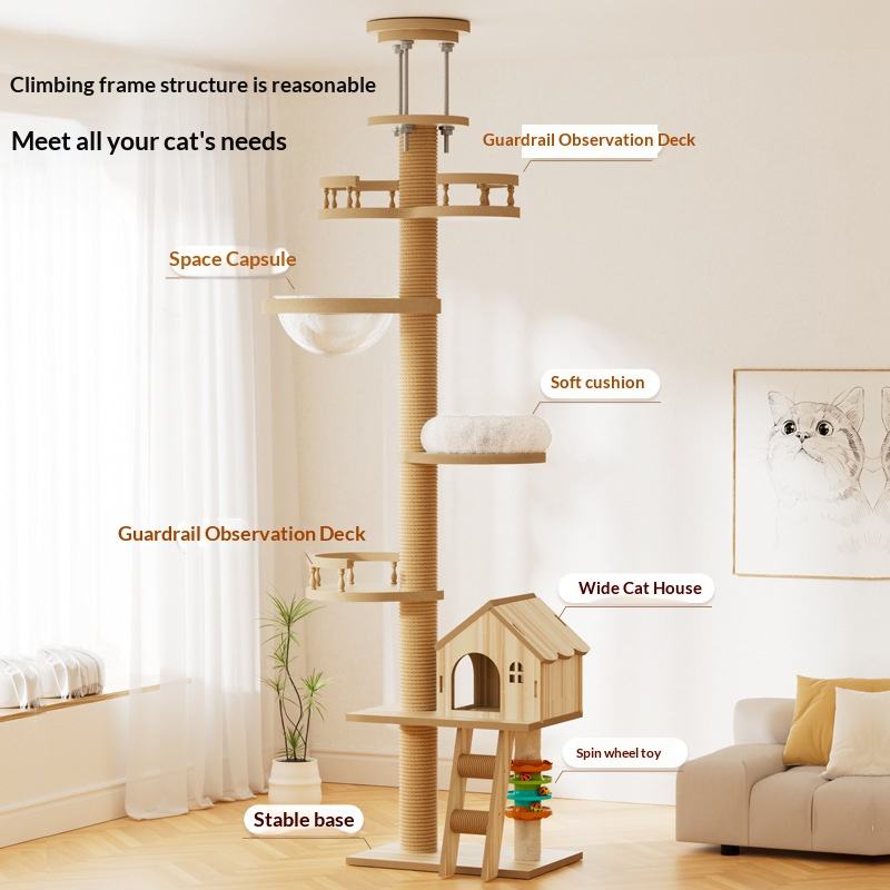 บ้านต้นไม้แมวแบบตั้งพื้นถึงเพดาน โครงไม้สำหรับแมวปีนป่าย เสาข่วนเล็บขนาดใหญ่