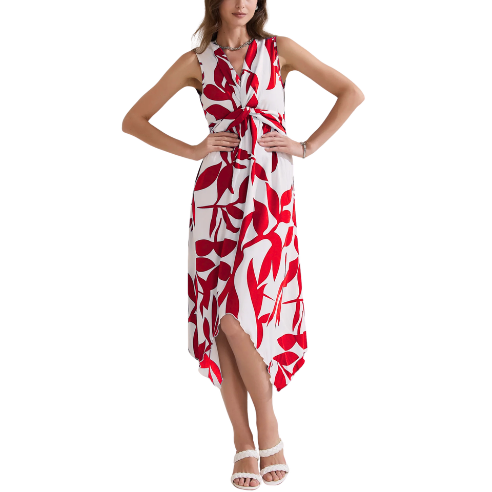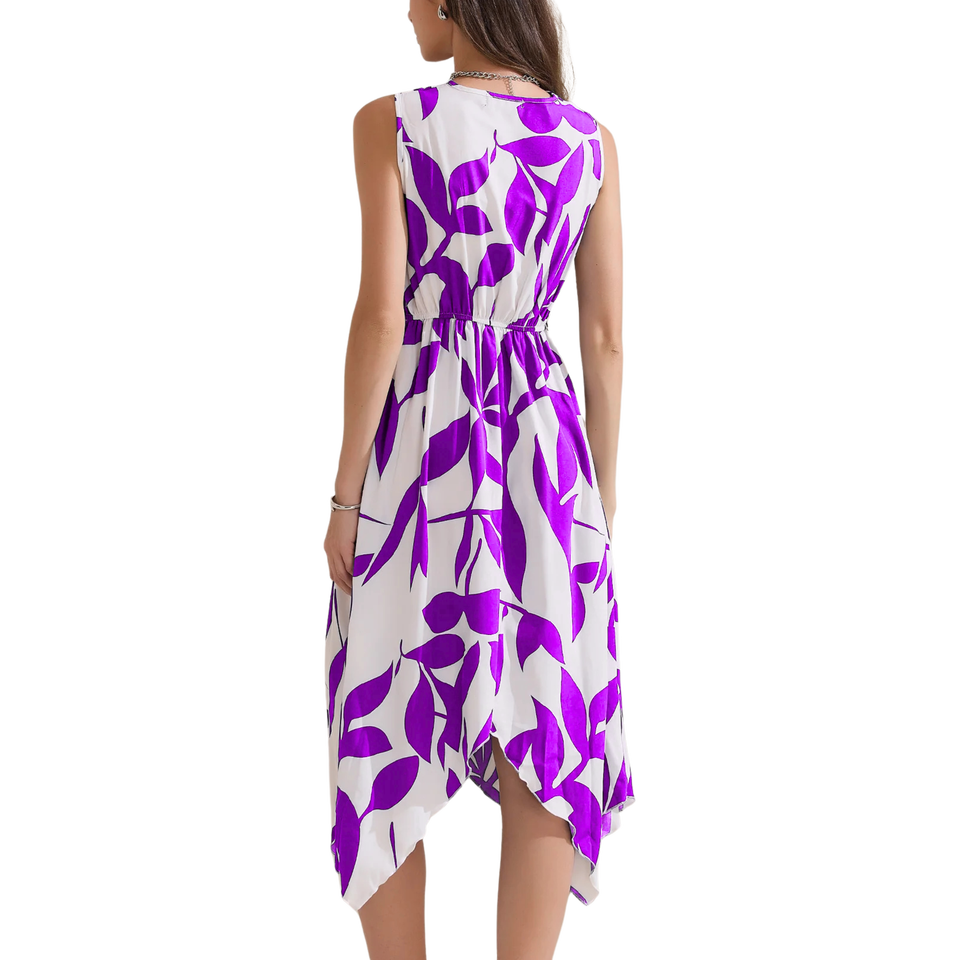 เดรสทรงเอลายดอกไม้ คอวีลึก ชายกระโปรงไม่สม่ำเสมอ แขนกุด ความยาวปานกลาง เอวธรรมชาติ สีพื้น ย้อมสีธรรมชาติ โพลีเอสเตอร์ 100% น้ำหนักเบา