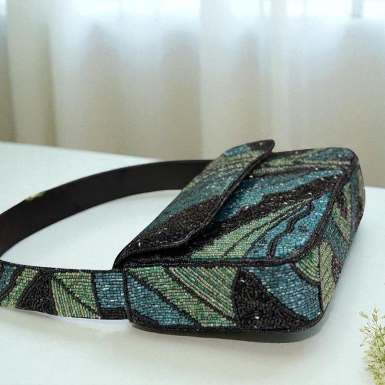 กระเป๋าบาแกตต์ประดับลูกปัดลายดอกไม้พร้อมหูหิ้ว - กระเป๋าสะพายทำมือ, กระเป๋าถือปักลายอินเดีย, งานปักลูกปัดหลากสี