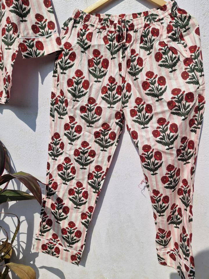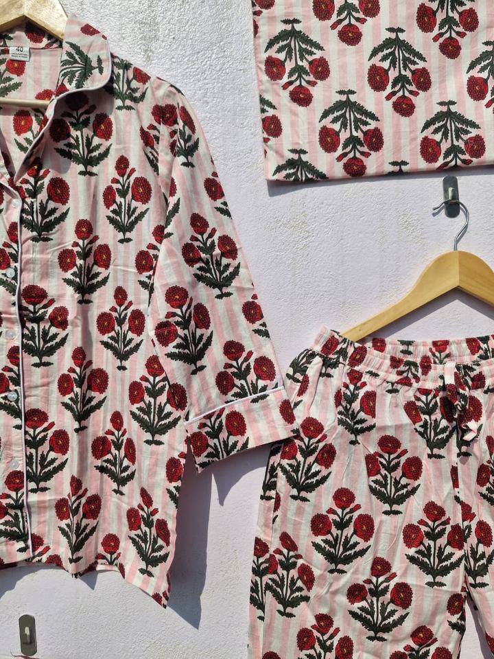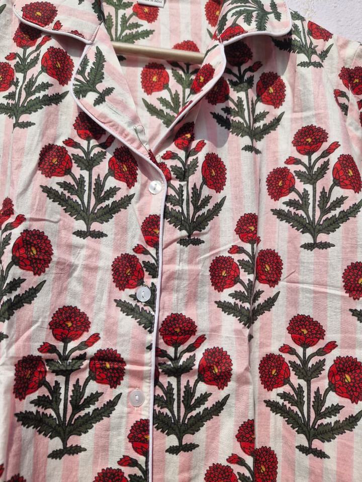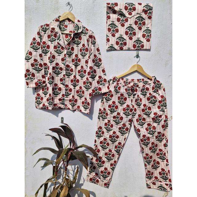ชุดชุดนอนผ้าฝ้ายพิมพ์ลายดอกไม้สำหรับผู้หญิงชุดกลางคืนลายทางทำมืออินเดียชุดอยู่บ้านผ้ามัสลินนุ่ม