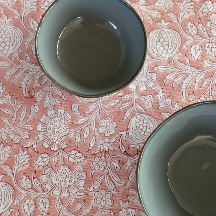 ผ้าปูโต๊ะลายดอกไม้พิมพ์ลายบล็อกสีชมพูและสีขาว ดีไซน์พิมพ์ลายด้วยมือ ผ้าฝ้าย 100%