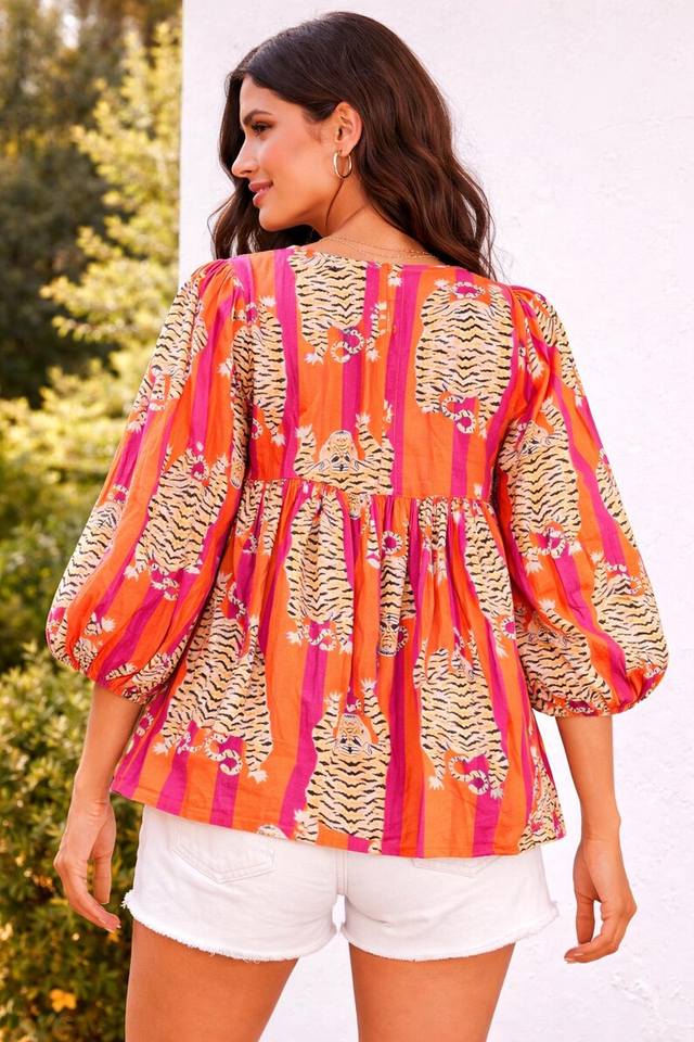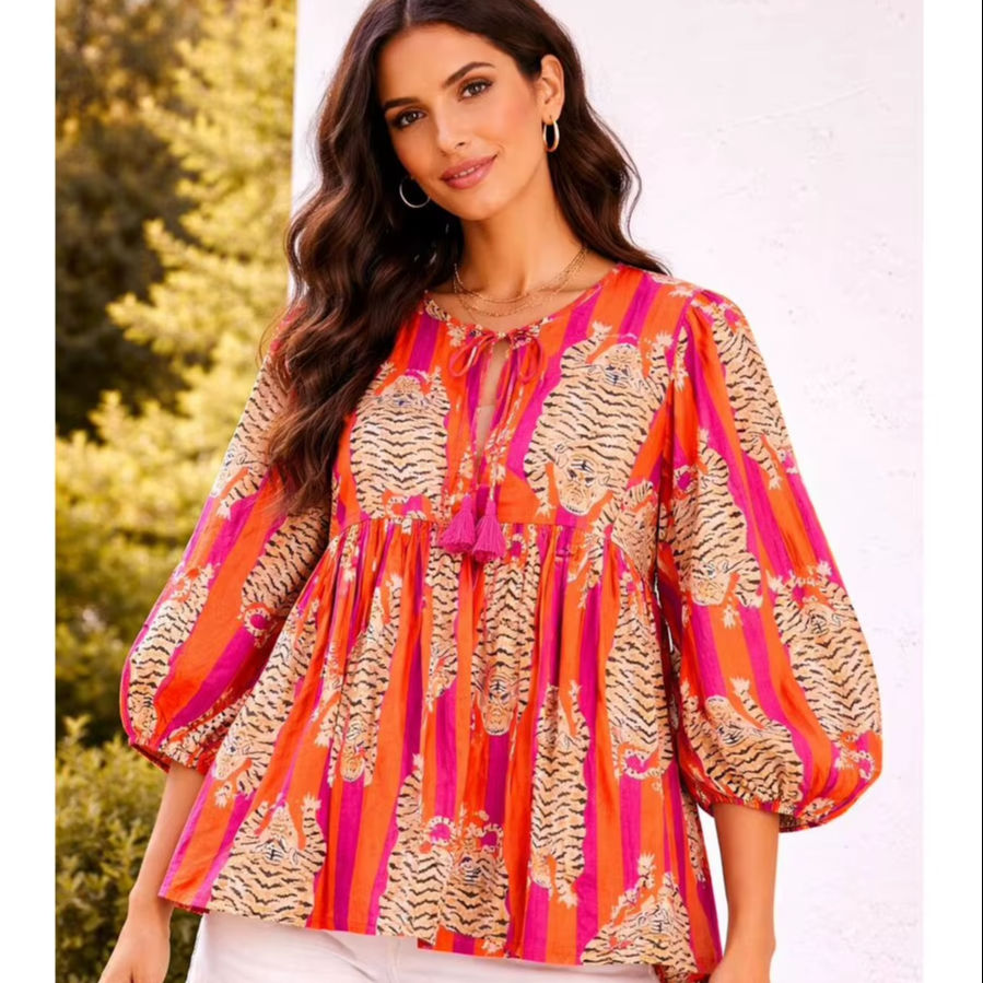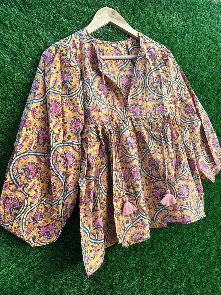 เสื้อทูนิคผ้าฝ้ายพิมพ์ลายดอกไม้: เดรสสั้นคอวีลึก