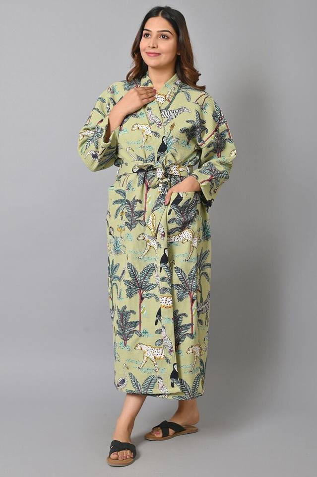 ชุดคลุมกิโมโนผ้าฝ้ายลายดอกไม้ ทอลายวาฟเฟิล คอวี ยาวเต็มตัว น้ำหนักเบา แห้งเร็ว เหมาะสำหรับฤดูร้อน