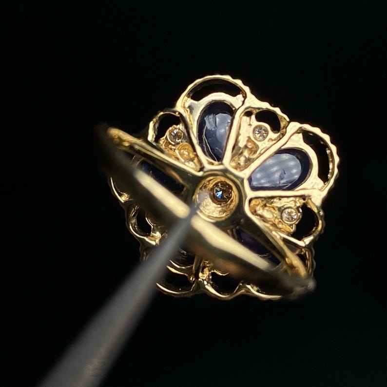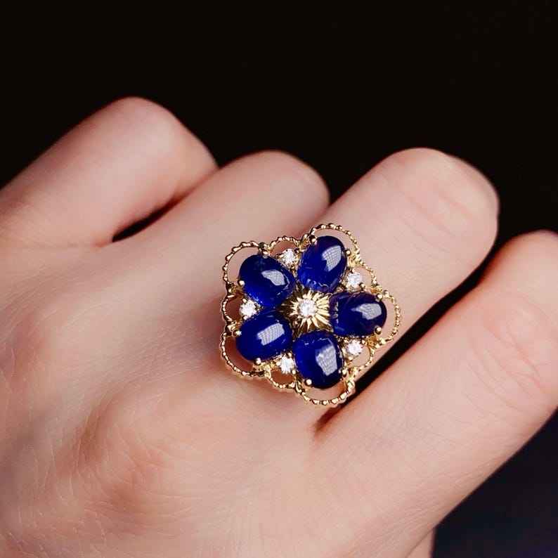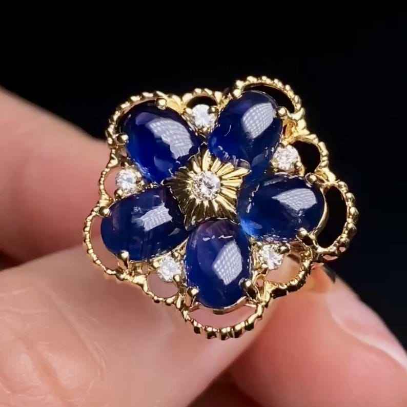 คีย์เวิร์ด:ดอกไม้ประดับยอดไพลินสีฟ้า14K แหวนทองแข็งสีรอยัลบลูมประกายโดดเด่น