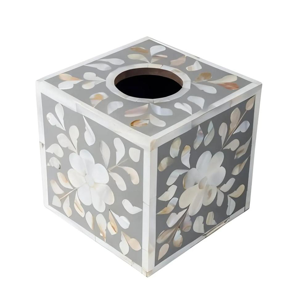 กล่องใส่กระดาษทิชชูทรงสี่เหลี่ยมลายดอกไม้สีเทาประดับมุก เหมาะสำหรับตกแต่งบ้านหรูหรา ตกแต่งโต๊ะและห้องรับแขกอย่างมีระดับ