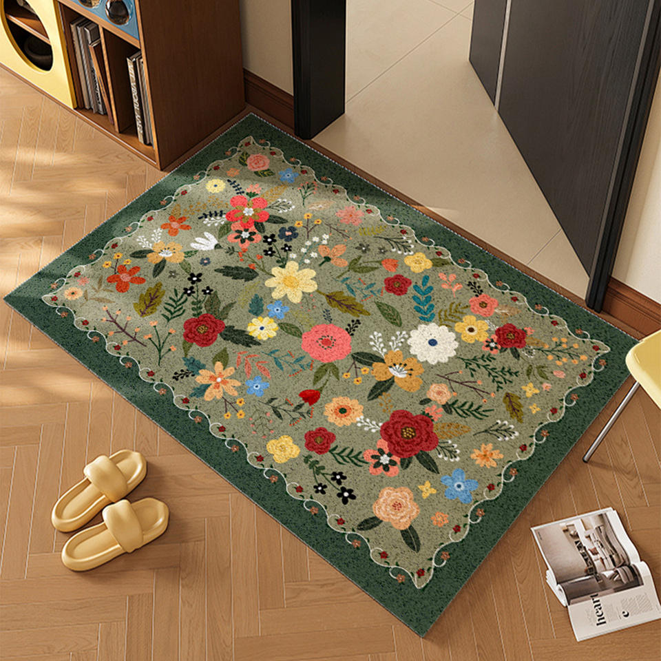 พรมเช็ดเท้าลายดอกไม้ รูปทรงสี่เหลี่ยมผืนผ้า ซักได้ สำหรับทางเข้าภายในบ้าน ลายไหมสีเขียวเบจ