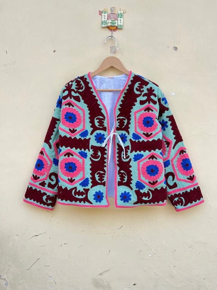 Suzani เสื้อแจ็คเก็ตปักลายดอกไม้สำหรับผู้หญิงเสื้อคลุมผ้าฝ้ายสไตล์โบฮีเมียนทำด้วยมือของขวัญสำหรับเธอสไตล์โบฮีเมียนอบอุ่น