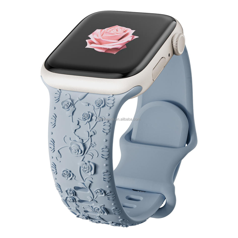 สายนาฬิกาข้อมือซิลิโคนนิ่มลายดอกไม้สลักลาย ขนาด 22 มม. แบบ Sport Loop พร้อมหัวเข็มขัด สำหรับผู้หญิง ดีไซน์ลายดอกนูน สำหรับนาฬิกา IWatch