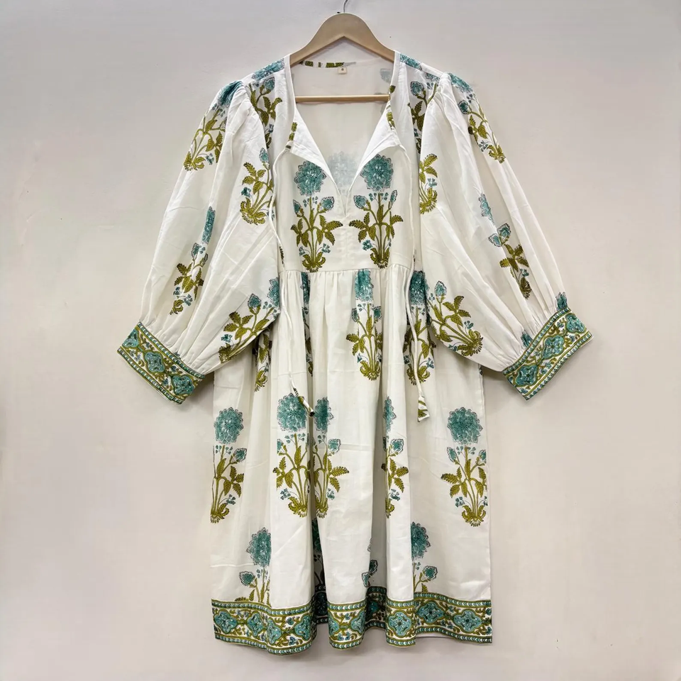 เดรสสั้นคอวี แขนสามส่วน ผ้าฝ้ายพิมพ์ลายดอกไม้ด้วยมือ เป็นมิตรต่อสิ่งแวดล้อม แต่งลูกไม้ ซักได้ ชายระบายแบบธรรมชาติ สไตล์โบฮีเมียน รุ่น Kyra
