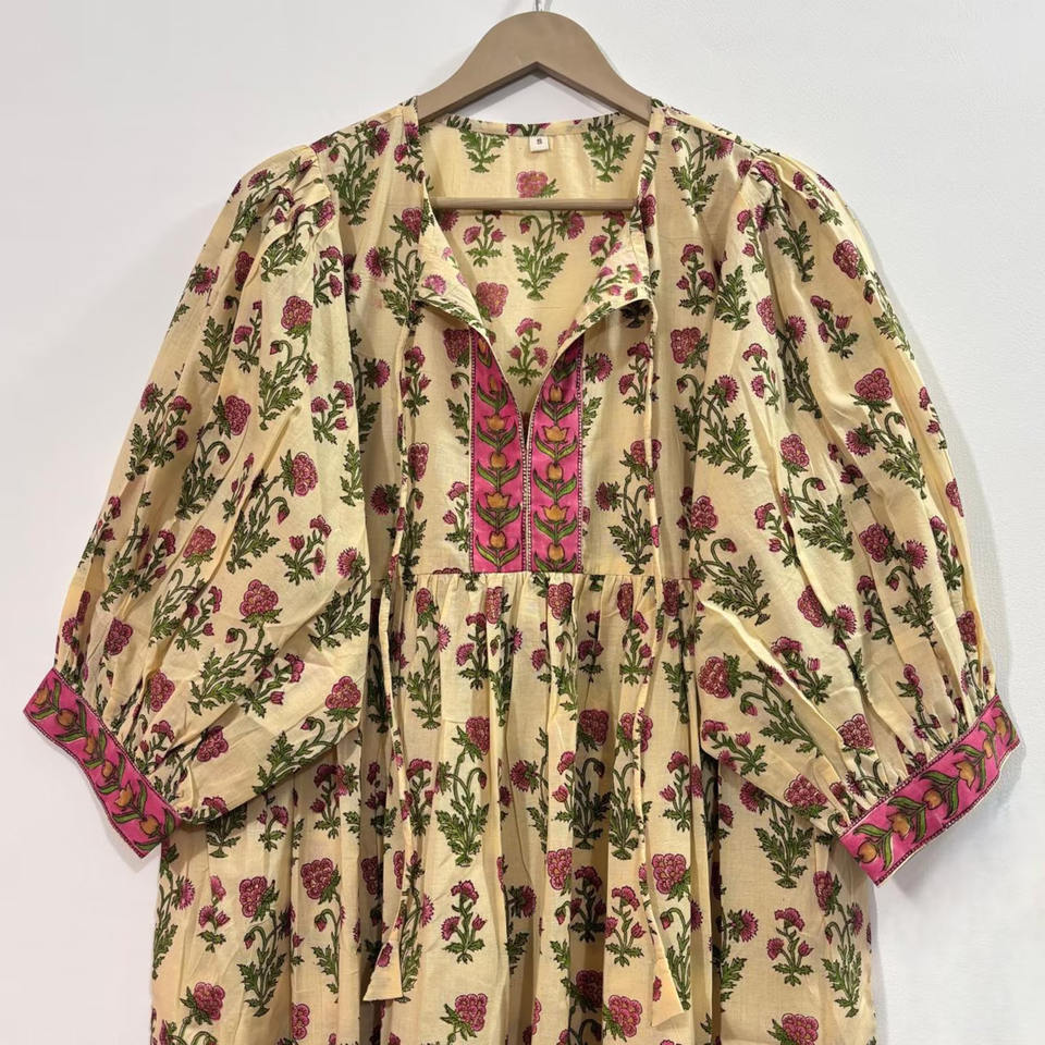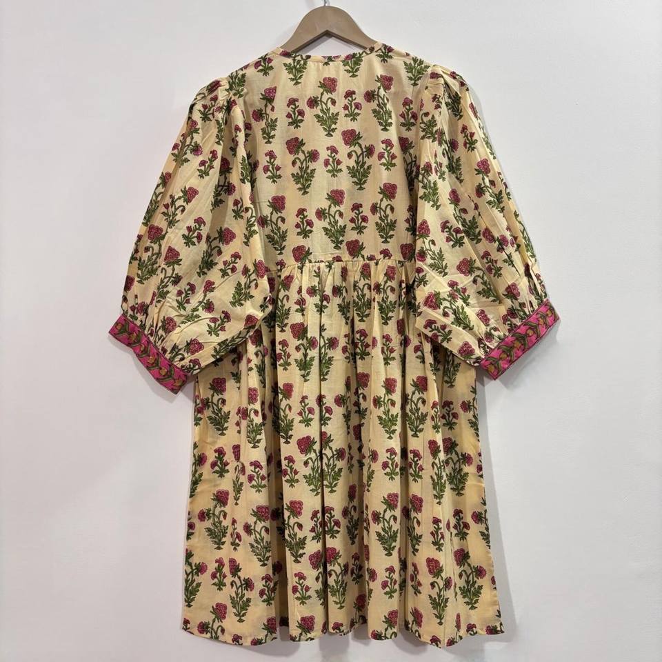 เดรสสั้นคอวี แขนสามส่วน ผ้าฝ้ายพิมพ์ลายดอกไม้ด้วยมือ เป็นมิตรต่อสิ่งแวดล้อม แต่งลูกไม้ เอวธรรมชาติ ซักได้ สไตล์คีร่า โบฮีเมียน เหมาะสำหรับใส่ทำงาน