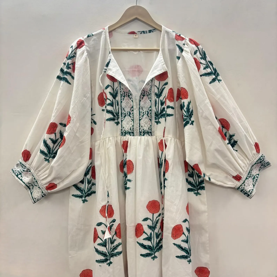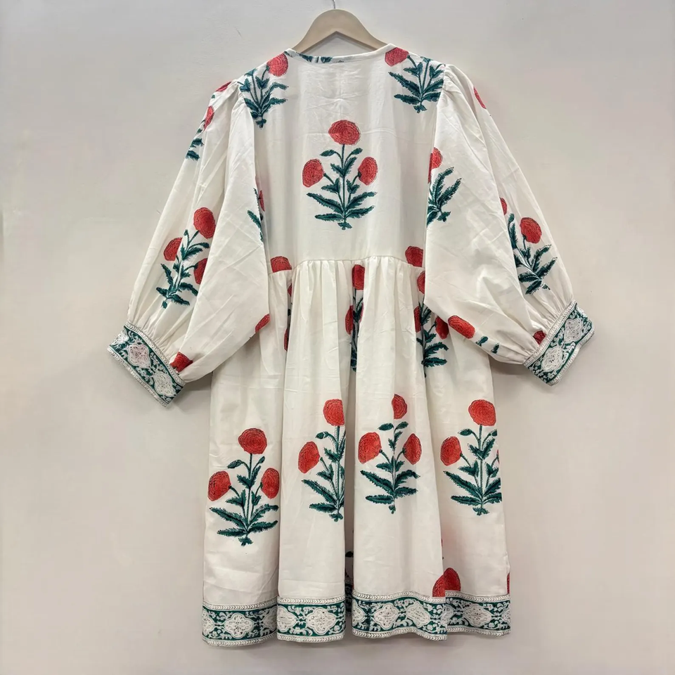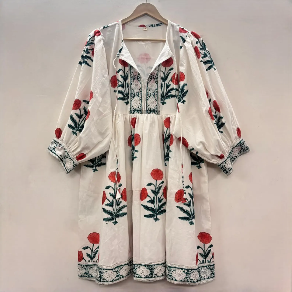 เดรสสั้นคอวี แขนสามส่วน ผ้าฝ้ายพิมพ์ลายดอกไม้แบบแฮนด์บล็อก เป็นมิตรต่อสิ่งแวดล้อม แต่งระบายลูกไม้ทำมือ รุ่นไคร่า สไตล์ธรรมชาติ ซักได้