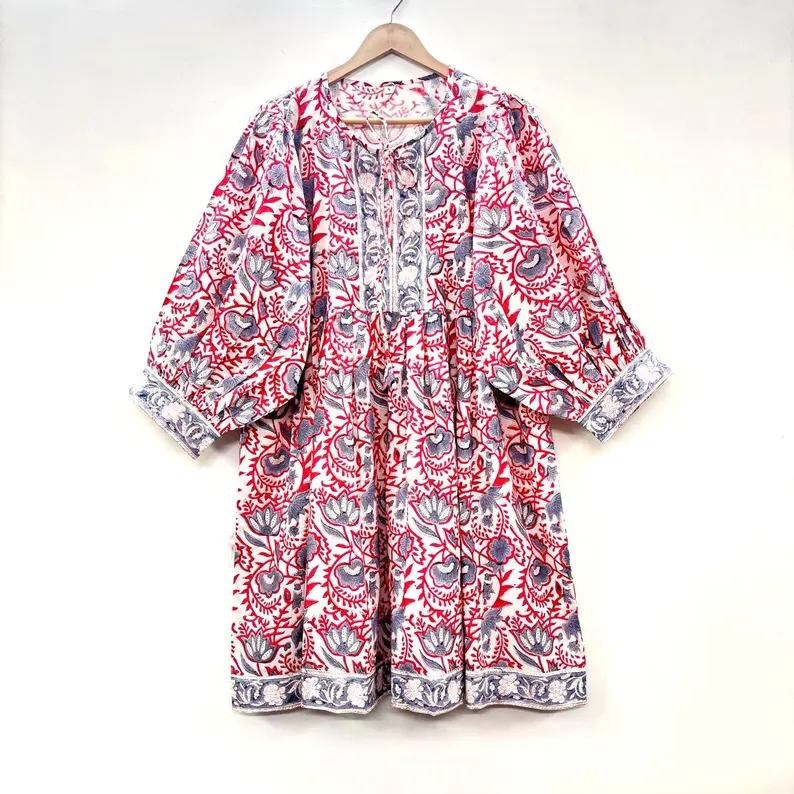 เดรสสั้นลายดอกพิมพ์ลายด้วยมือ ผ้าฝ้ายรักษ์โลก คอวี แขนสามส่วน แต่งลูกไม้ เอวธรรมชาติ ชายระบาย ซักได้ สไตล์วินเทจ เหมาะสำหรับโอกาสพิเศษ