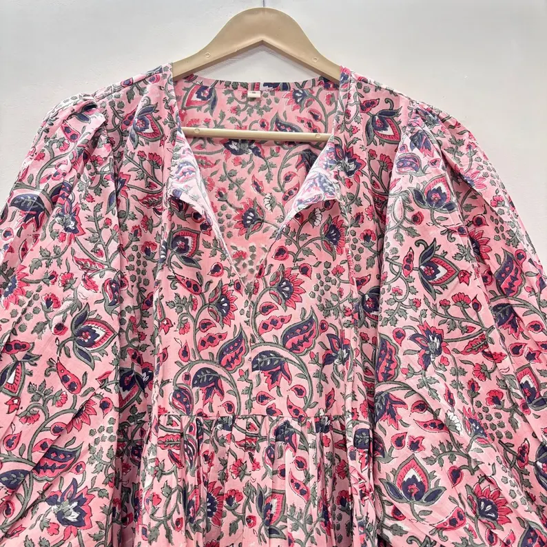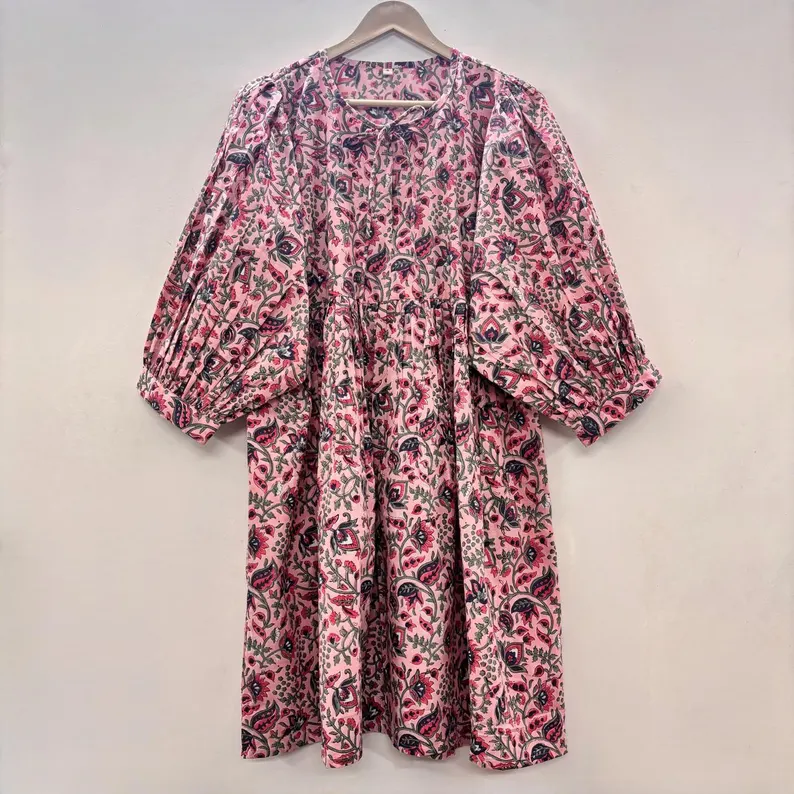 เดรสสั้นลายดอกพิมพ์ลายบล็อกด้วยมือ ผ้าฝ้าย 100% เป็นมิตรกับสิ่งแวดล้อม แต่งลูกไม้สไตล์ชิโนเซอรี ซักได้ คอวี แขนสั้น สไตล์โบฮีเมียน