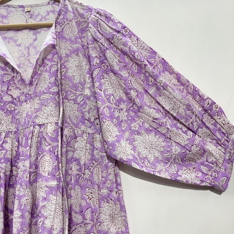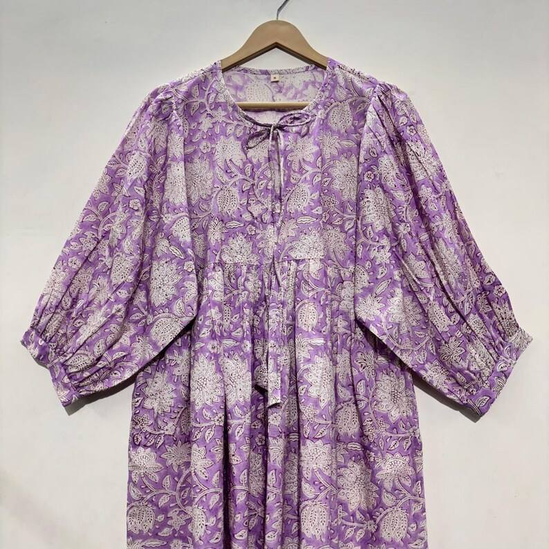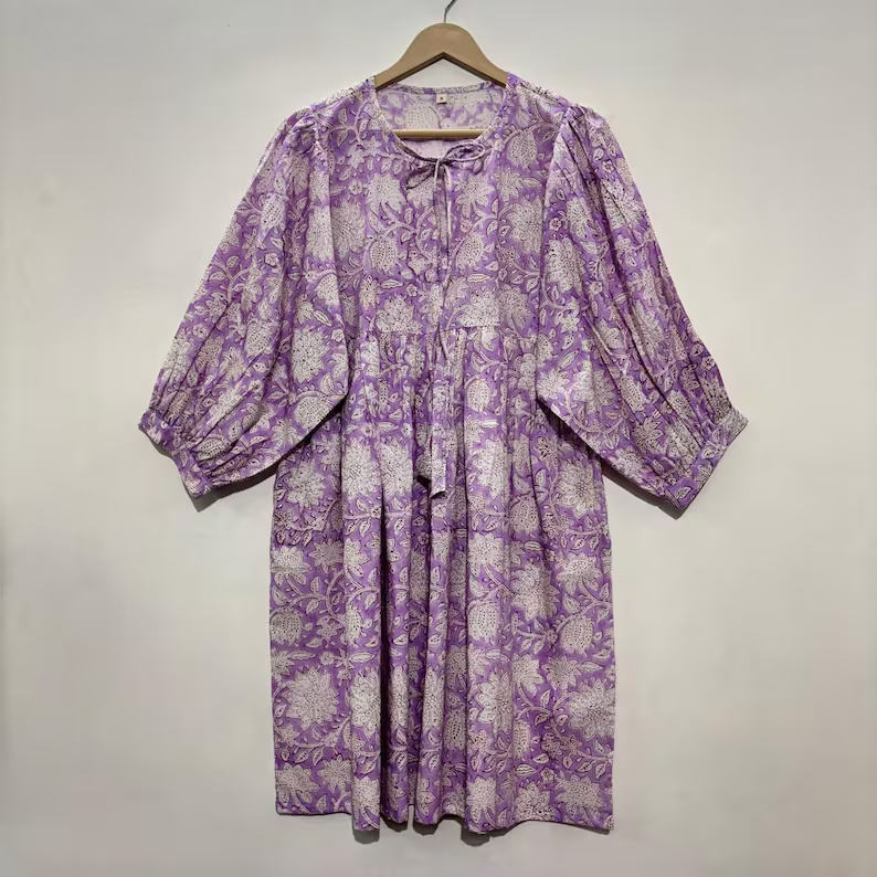 เสื้อคอวีผ้าฝ้ายพิมพ์ลายดอกไม้แบบแฮนด์บล็อก เป็นมิตรต่อสิ่งแวดล้อม แขนสามส่วน แต่งระบายลูกไม้ทำมือ ซักได้ ไม่ยับ ทรงเอวธรรมชาติ