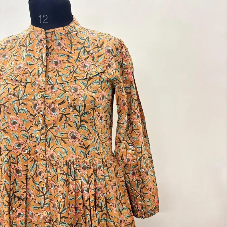 ลายพิมพ์ดอกไม้แบบแฮนด์บล็อก เป็นมิตรกับสิ่งแวดล้อม ผ้าฝ้าย 100% คอวี แขนสามส่วน แต่งลูกไม้ทำมือ ชายระบาย ซักได้ ทรงเอวธรรมชาติ
