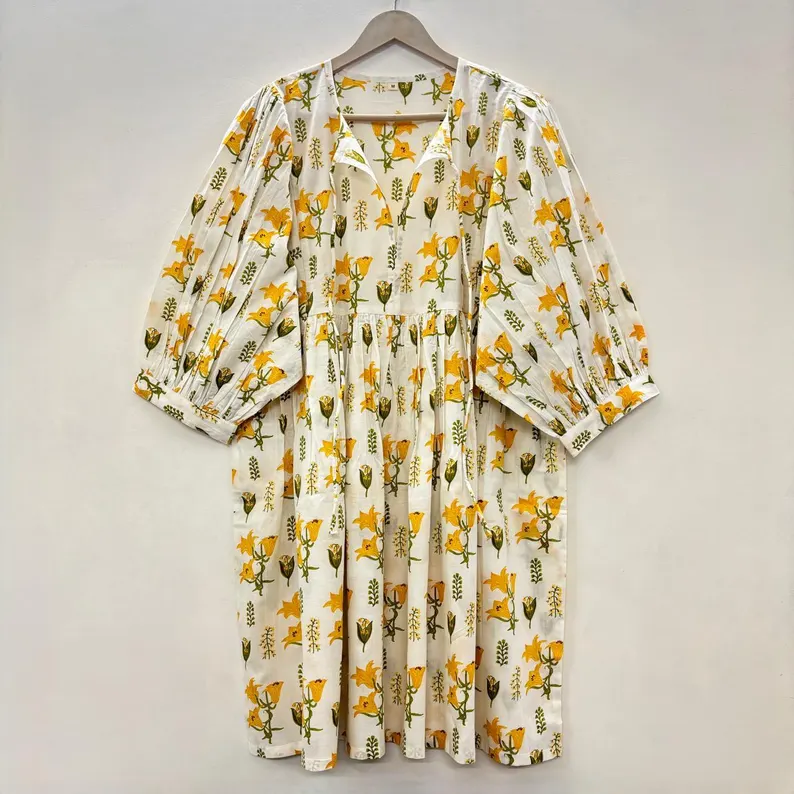 เสื้อทูนิคสั้นลายดอกพิมพ์ลายบล็อกด้วยมือ ผ้าฝ้ายรักษ์โลก คอวี แขนสามส่วน แต่งระบายลูกไม้ทำมือ ซักได้ ลายชิโนเซอรีแบบธรรมชาติ