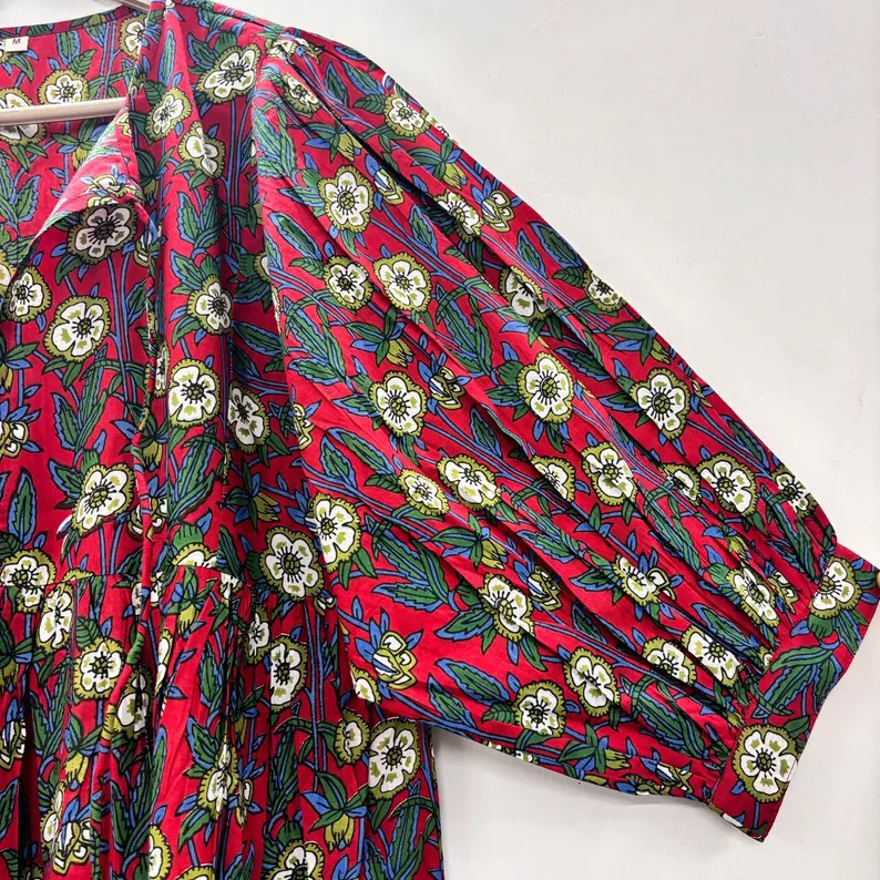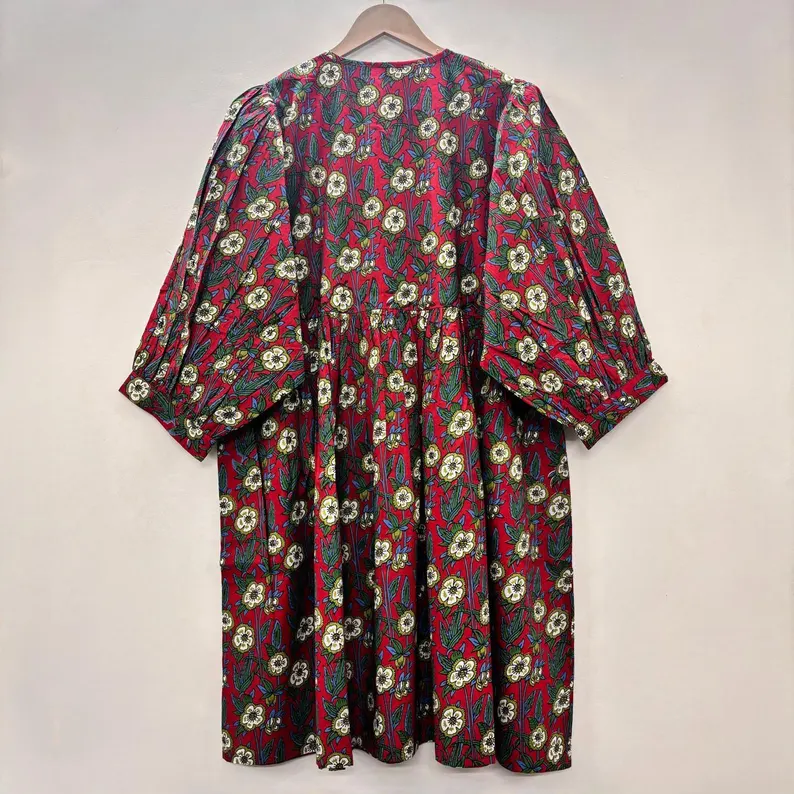 เดรสสั้นคอวี แขนสามส่วน ผ้าฝ้ายพิมพ์ลายดอกไม้แบบแฮนด์บล็อก เป็นมิตรต่อสิ่งแวดล้อม แต่งระบายชายกระโปรงด้วยลูกไม้ทำมือ สไตล์ไครา ชิโนเซอรี สำหรับโอกาสพิเศษ