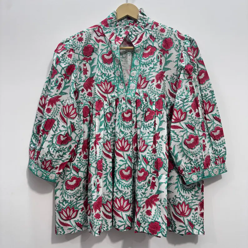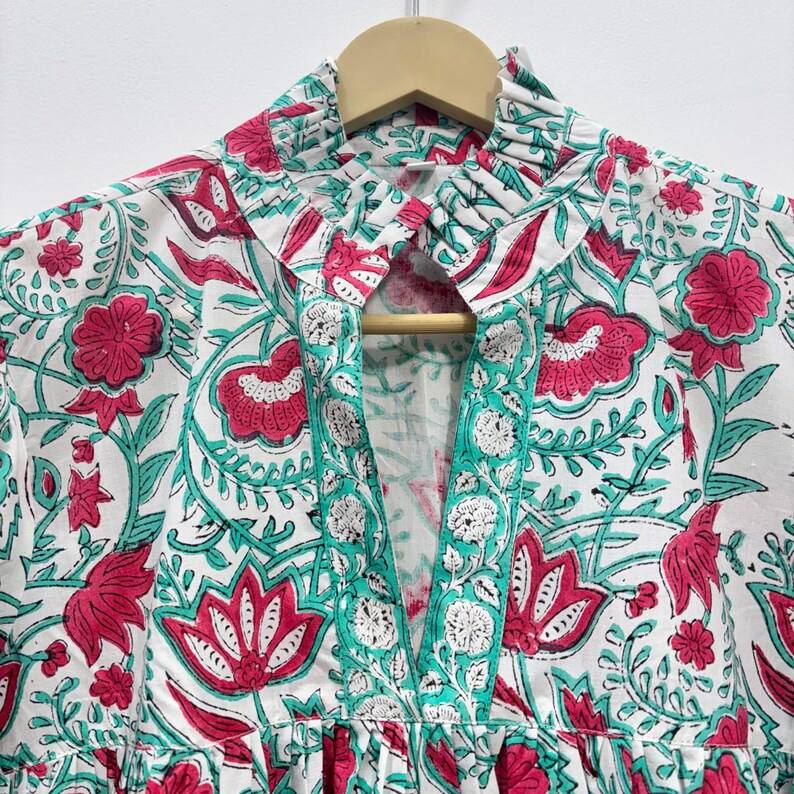 เดรสสั้นคอวี แขนสามส่วน ผ้าฝ้ายพิมพ์ลายดอกไม้แบบแฮนด์บล็อก เป็นมิตรต่อสิ่งแวดล้อม แต่งระบายลูกไม้ทำมือ ซักได้ สไตล์ไคร่า