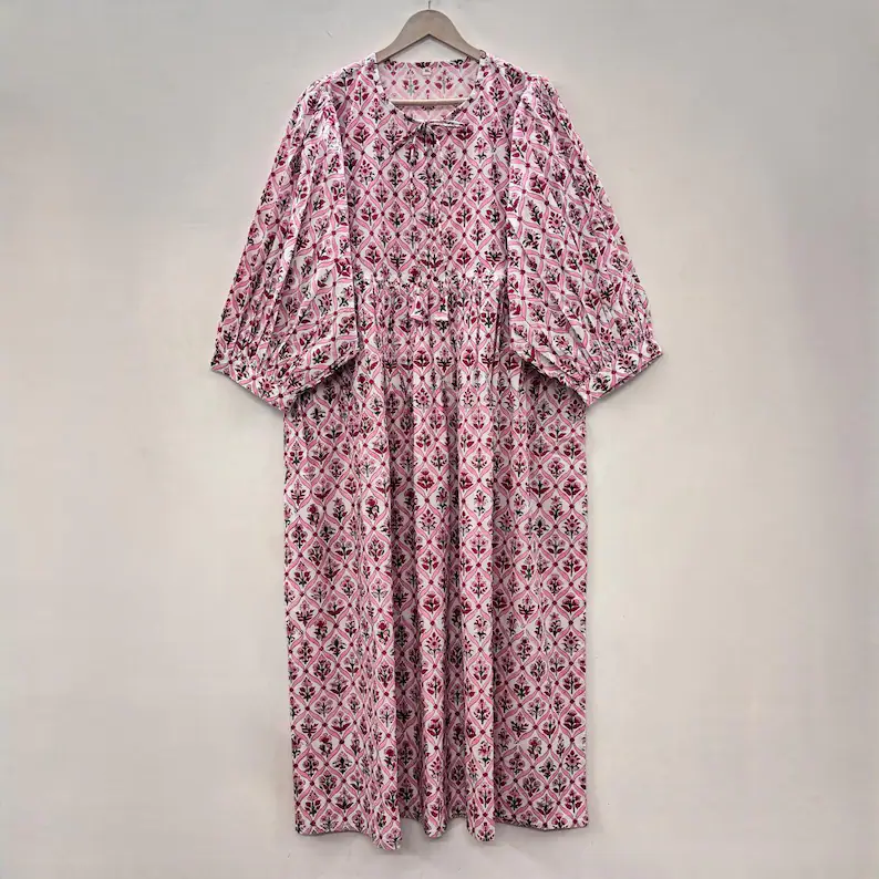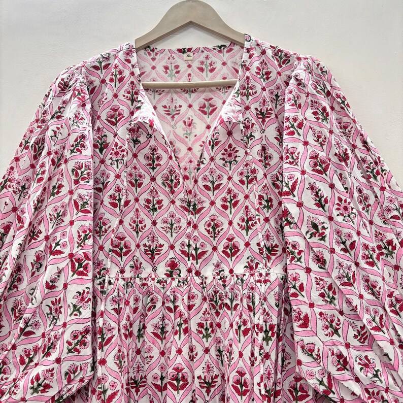 Floral Hand Block Print Handmade Eco-Friendly Cotton V-neck 3/4 Sleeve Lace Ruffle Hem Natural Washable Formal Chinoiserie Tunic